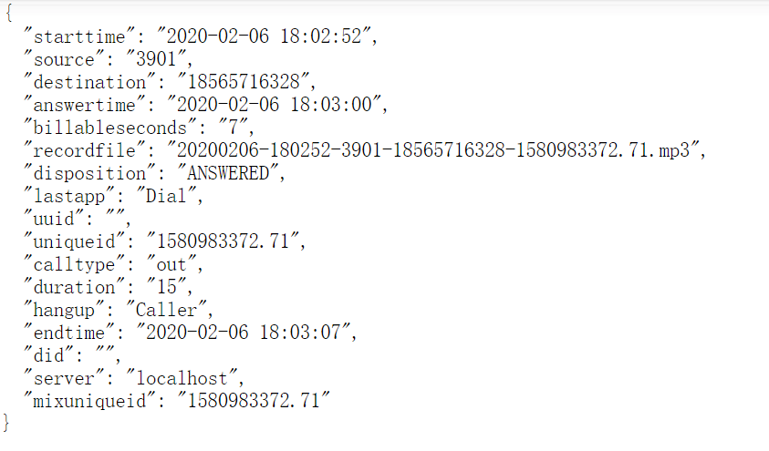 recordfile | string | 录音文件名 | 录音文件名:日期-时分秒-主叫号-被叫号-唯一标识.mp3 |