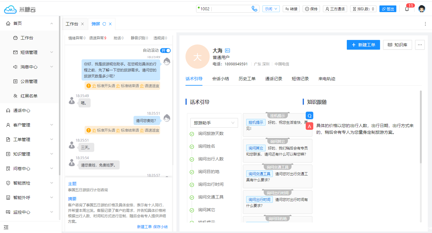 l 智能助手可以为座席提供实时的话术推荐,当系统检测到客户在沟通中提出的顾虑点,系统将基于企业上传过的文档、知识库和大模型等多个来源中迅速找到对应的答案,组织成一段简练的话术,供座席参考。