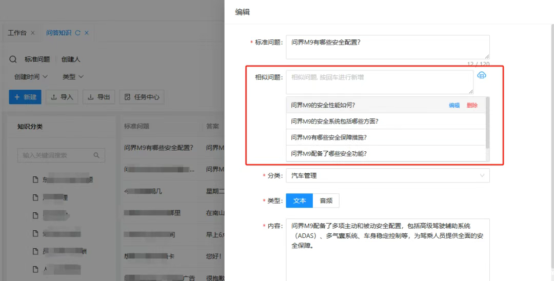 FAQ智能扩写:上传基础问答对,大模型一键生成标准问答库,自动补充相似问法、扩展场景话术,5分钟完成相当于人工40小时的整理工作,大幅提升知识构建效率。