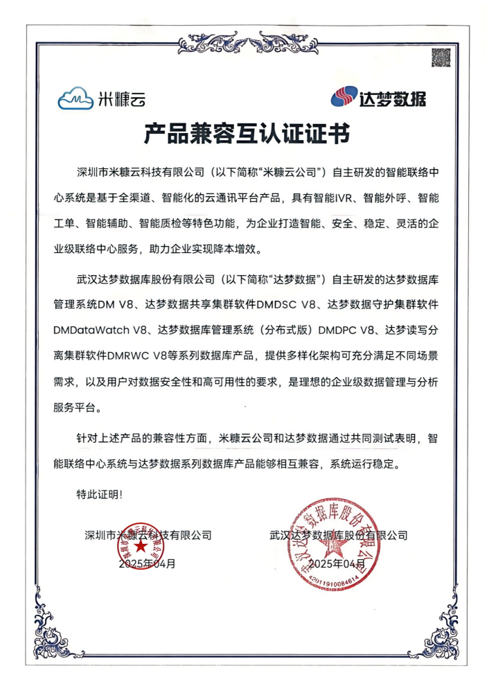 测试结果显示,米糠云智能联络中心系统与达梦数据库管理系统(DM8)在功能、性能、兼容性方面表现卓越,系统运行稳定高效,能够为企业级联络中心系统建设提供坚实的技术底座。